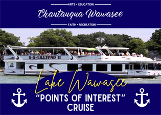 Chautauqua-Wawasee and the Syracuse-Wawasee Historical Museum have arranged for local historian Ann Garceau to narrate an Historical Cruise of Lake Wawasee aboard the SS Lillypad II. Ann will share her knowledge about historic hotels, events, property owners, restaurants, entertainment venues, boat taxis, marinas, other points of interest and little-known facts as the SS Lillypad proceeds around the shoreline of Lake Wawasee. Snack food will be provided along with a cash bar.